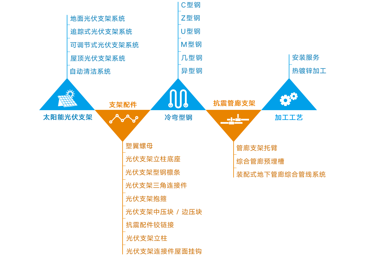 公司始終專注于生產(chǎn)太陽能光伏支架及支架配件(地面支架系統(tǒng)、屋頂支架系統(tǒng)、可調(diào)節(jié)式支架系統(tǒng)、追蹤式支架、自動(dòng)清潔系統(tǒng)等),C、Z、U、M、幾、異型、等冷彎型鋼,管廊抗震支架、代理熱鍍鋅加工、安裝等服務(wù)。