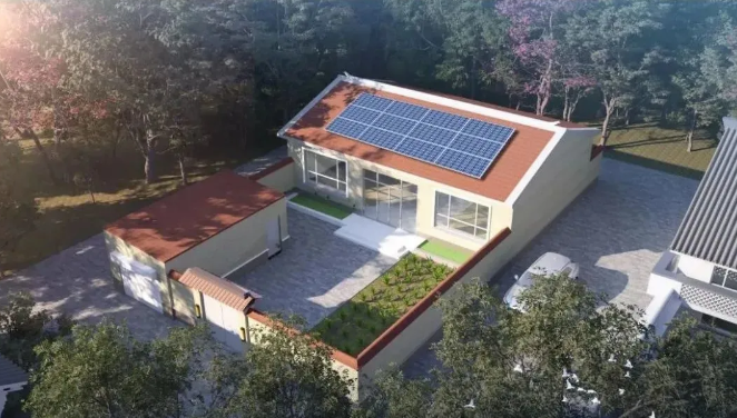 北部村落原本就有安裝太陽(yáng)能的習(xí)慣,因此該設(shè)計(jì)延用了北部山區(qū)坡度較大的灰色坡屋頂,安裝戶(hù)用光伏電站,采光好,光伏電站發(fā)電量高。