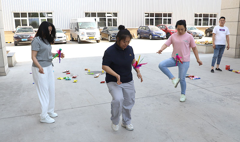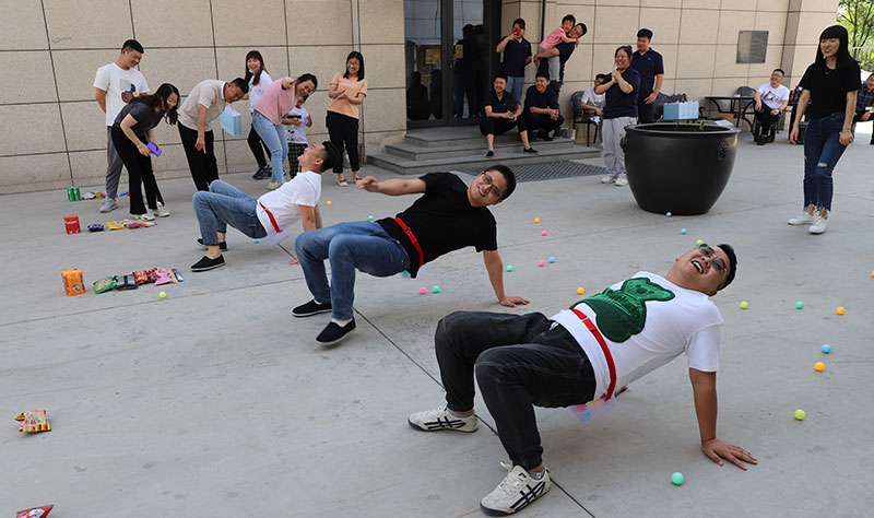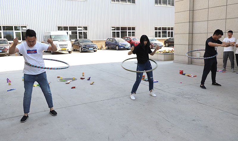 “旋轉(zhuǎn)呼啦圈、組隊踢毽子、公雞下蛋、快樂傳遞、螃蟹賽跑……員工們充滿了歡聲笑語、玩兒得不亦樂乎。手拉手站成一排,用呼啦圈穿過所有人的身體,用時最短的隊伍最終取得獲勝……每隊出三個代表,腰間都系上道具盒,通過不斷扭動身體讓盒里的乒乓球掉下來,用時最短的隊獲勝……