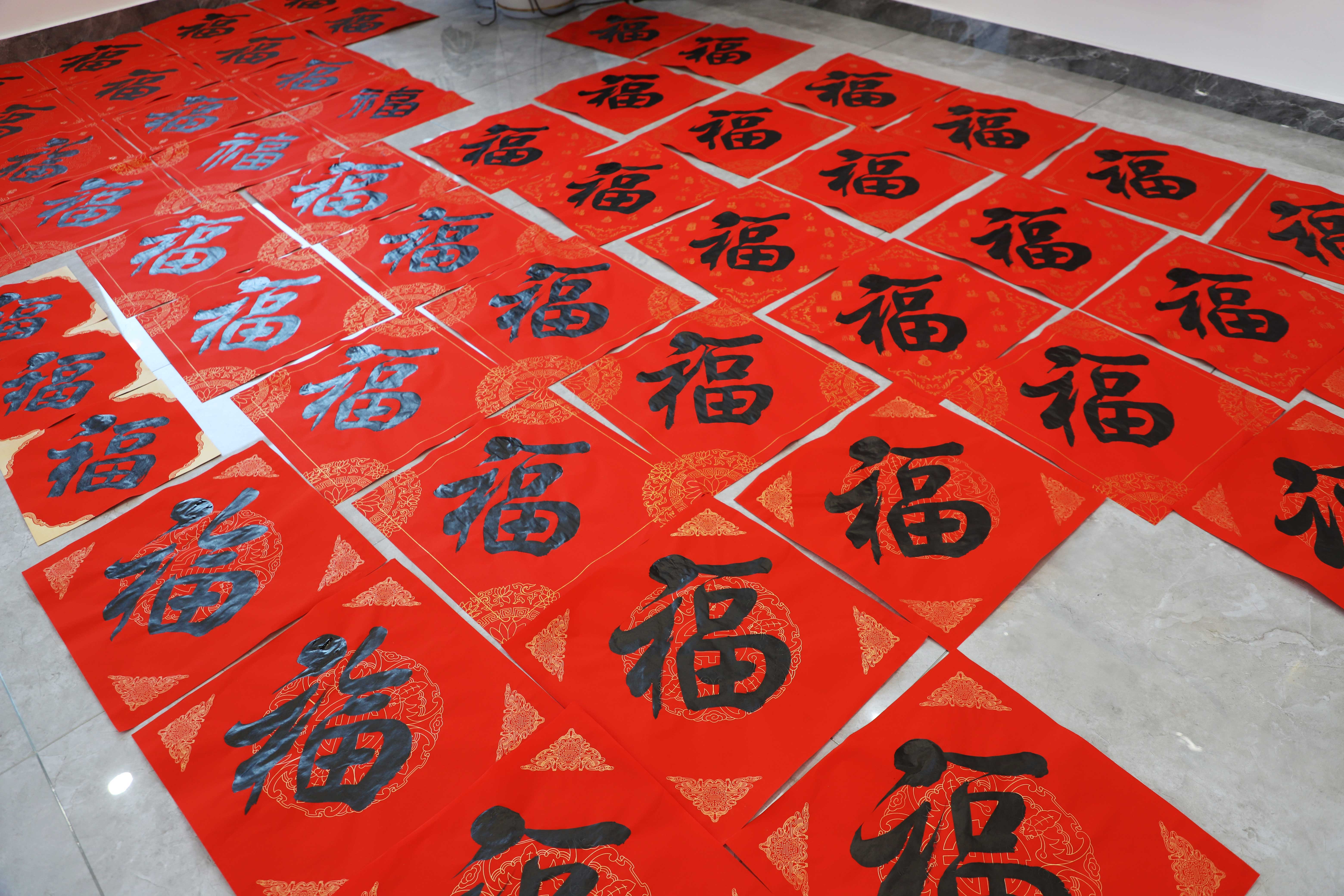 王總將筆墨紙硯,正方形紅色彩紙擺放于桌面。她蘸墨、起筆、運腕,橫豎撇捺之間,“福”字躍然紙上。