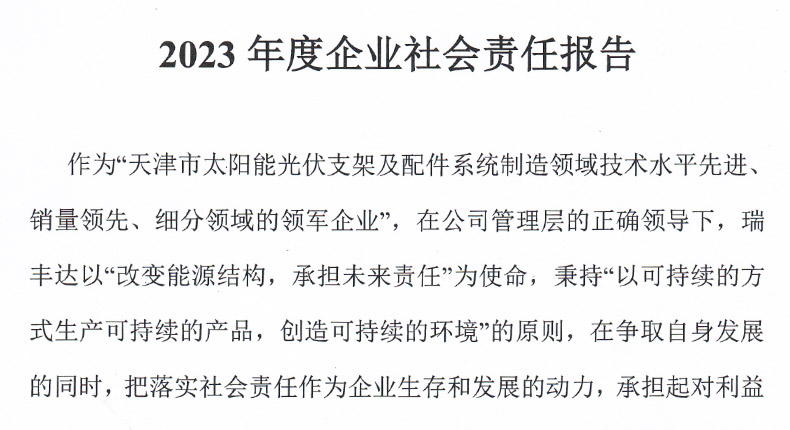 作為“天津市太陽能光伏支架及配件系統(tǒng)制造領(lǐng)域技術(shù)水平先進(jìn)銷量領(lǐng)先、細(xì)分領(lǐng)域的領(lǐng)軍企業(yè)”,在公司管理層的正確領(lǐng)導(dǎo)下,瑞豐達(dá)以“改變能源結(jié)構(gòu),承擔(dān)未來責(zé)任”為使命,