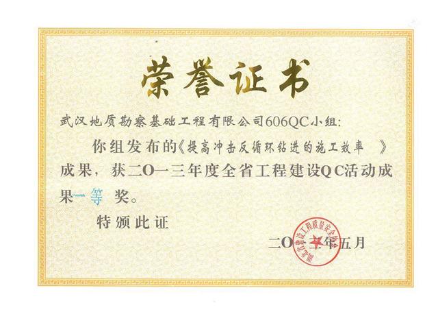 2013年5月,武漢地質(zhì)勘察基礎(chǔ)工程有限公司606QC小組發(fā)布的《提高沖擊反循環(huán)鉆進(jìn)的施工效率》成果,被湖北省建設(shè)工程質(zhì)量安全協(xié)會授予2013年度全省工程建設(shè)QC活動成果一等獎。