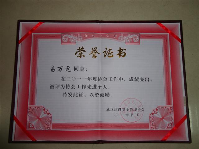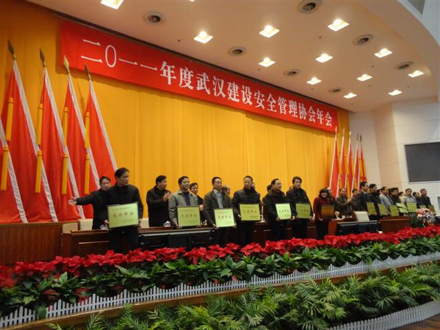 2011年12月30日,在武漢市委會(huì)議中心召開的2011年度武漢建設(shè)安全管理協(xié)會(huì)年會(huì)上,武基公司榮獲2011年度協(xié)會(huì)工作先進(jìn)單位,公司總經(jīng)理易萬元被評(píng)為2011年度協(xié)會(huì)工作先進(jìn)個(gè)人榮譽(yù)稱號(hào)。