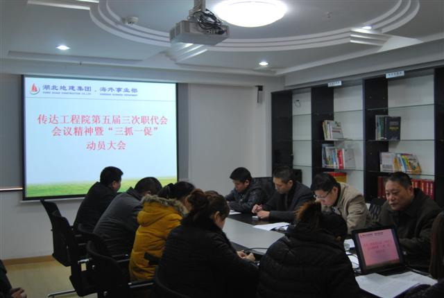 會(huì)議傳達(dá)了院五屆三次職代會(huì)精神,認(rèn)真組織學(xué)習(xí)了院長程立文所作的《凝神聚力,開拓創(chuàng)新,推動(dòng)工程院發(fā)展再上新臺(tái)階》工作報(bào)告和在開展“三抓一促”活動(dòng)動(dòng)員大會(huì)上的講話,就工程院“做強(qiáng)做穩(wěn)海外事業(yè)作為富院之策”的“走出去”戰(zhàn)略進(jìn)行了重點(diǎn)詮釋。