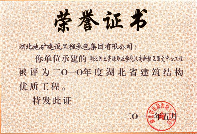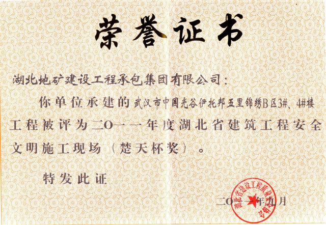 據(jù)悉,“安全文明施工現(xiàn)場(楚天杯)”獎是湖北省建筑行業(yè)安全文明施工的最高榮譽(yù)獎項(xiàng),目的在于鼓勵建筑施工企業(yè)搞好安全文明施工,提高全省建筑施工安全生產(chǎn)水平。該獎項(xiàng)的評定是從建設(shè)、施工、監(jiān)理等方面,對項(xiàng)目現(xiàn)場進(jìn)行全方位考評。 另訊,日前收到湖北省住房和城鄉(xiāng)建設(shè)廳文件《關(guān)于公布2010-2011年度第一批湖北省建筑結(jié)構(gòu)優(yōu)質(zhì)工程名單的通知》(鄂建文〔2011〕61號),地建承包公司承建的湖北國土資源職業(yè)學(xué)院漢南新校區(qū)圖文中心工程和鄂東北地質(zhì)大隊(duì)孝感基地經(jīng)濟(jì)適用房工程名列其中。