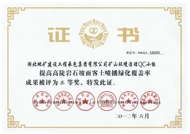 勘察公司選送的礦山環(huán)境治理QC小組《提高高陡巖石坡面客土噴播綠化覆蓋率》成果被評為三等獎(jiǎng),礦山環(huán)境治理QC小組被評為“優(yōu)秀質(zhì)量管理小組”。