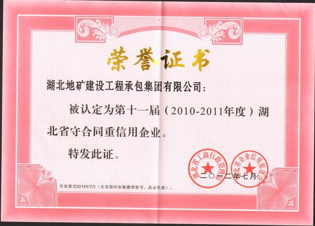 近日,地建承包公司和武基公司均被湖北省工商行政管理局、湖北省企業(yè)信用促進(jìn)會(huì)授予第十一屆(2010-2011年度)湖北省守合同重信用企業(yè)。