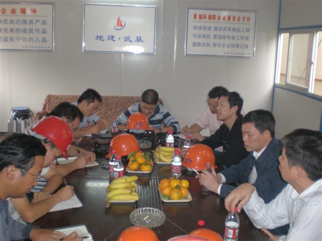 2009年10月26日下午,湖北省地礦局企業(yè)指導處處長鐘偉等一行來到湖北地建.武基公司施工的瑞安永清片A5地塊樁基施工項目檢查指導工作。檢查組對整個施工現(xiàn)場安全生產(chǎn)情況進行了認真細致的檢查,還針對如何做好和經(jīng)營好施工項目提出了一些寶貴意見,結(jié)合本施工項目規(guī)模大、施工現(xiàn)場人員多、設備多、工藝多、交叉作業(yè)多、集中施工時工作面小等特點,在如何抓好安全生產(chǎn)方面提出了合理化建議。