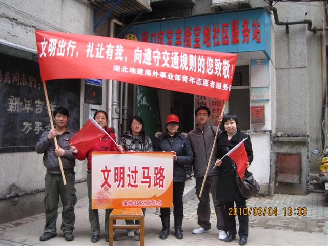 為了迎接3.5“中國青年志愿者服務(wù)日”,湖北地建海外事業(yè)部團(tuán)支部聯(lián)絡(luò)了硚口區(qū)寶地社區(qū)居委會(huì),組織員工于3月4日13:00前往建設(shè)大道云都酒店路口進(jìn)行“文明過馬路”主題宣傳活動(dòng)?;顒?dòng)得到全體在漢員工的積極響應(yīng),大家紛紛帶上小紅帽、挽起宣傳章、拿上小紅旗,成為一名光榮的志愿者,為路人提供了熱情周到的服務(wù)。