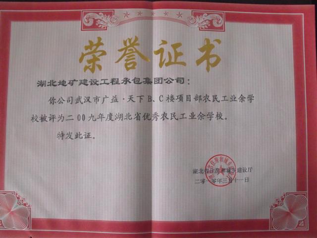 2010年3月11日,湖北地建承包公司廣益·天下B、C棟項目部榮獲2009年度湖北省優(yōu)秀農(nóng)民工業(yè)余學(xué)校榮譽稱號,湖北省住房和城鄉(xiāng)建設(shè)廳頒發(fā)榮譽證書。