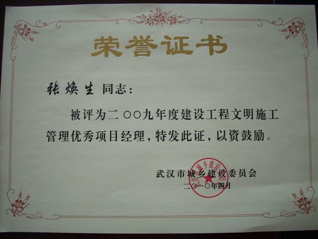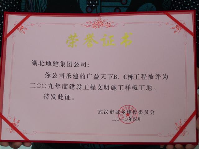 2010年4月,廣益·天下B、C棟項目榮獲2009年度建設工程文明施工樣板工地榮譽稱號,同時,該項目經(jīng)理張煥生被評為武漢市2009年度建設工程文明施工管理優(yōu)秀項目經(jīng)理,武漢市城鄉(xiāng)建設委員會頒發(fā)榮譽證書。