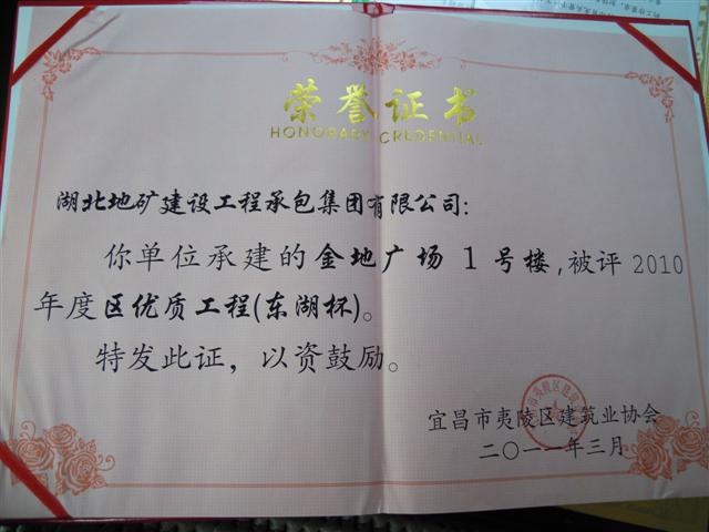 2011年3月31日,夷陵區(qū)住房與城鄉(xiāng)建設(shè)局召開了住建系統(tǒng)2011年度工作會議。會議對2010年度先進單位和個人進行了獎勵。由湖北地礦建設(shè)工程承包公司承建的金地廣場1#樓項目被評為“區(qū)文明施工現(xiàn)場”“區(qū)優(yōu)質(zhì)結(jié)構(gòu)”“區(qū)優(yōu)質(zhì)工程(東湖杯)”,并被推薦為省優(yōu)質(zhì)工程(楚天杯)項目,鄧?yán)^國被評為區(qū)“優(yōu)秀項目經(jīng)理”。夷陵區(qū)住房與城鄉(xiāng)建設(shè)局黨組書記、局長覃萬橋,黨組副書記、副局長何光林,副局長王同林、萬平等領(lǐng)導(dǎo)出席會議并為獲獎單位頒獎。